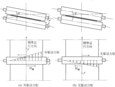 若輥?zhàn)邮菐?qū)動(dòng)的,給不銹鋼帶的作用力是向前的動(dòng)力,則不銹鋼帶所受到的向前的動(dòng)力的合力偏向不銹鋼帶被夾緊的一端,會(huì)產(chǎn)生一個(gè)使不銹鋼帶向這一方向偏移的力偶M偏,所以不銹鋼帶是向著壓力大、輥?zhàn)娱_口小的一端偏移。若輥?zhàn)邮菑膭?dòng)的,給不銹鋼帶的作用力是向后的阻力,則會(huì)使不銹鋼帶向壓力小、輥?zhàn)娱_口大的一端偏移。